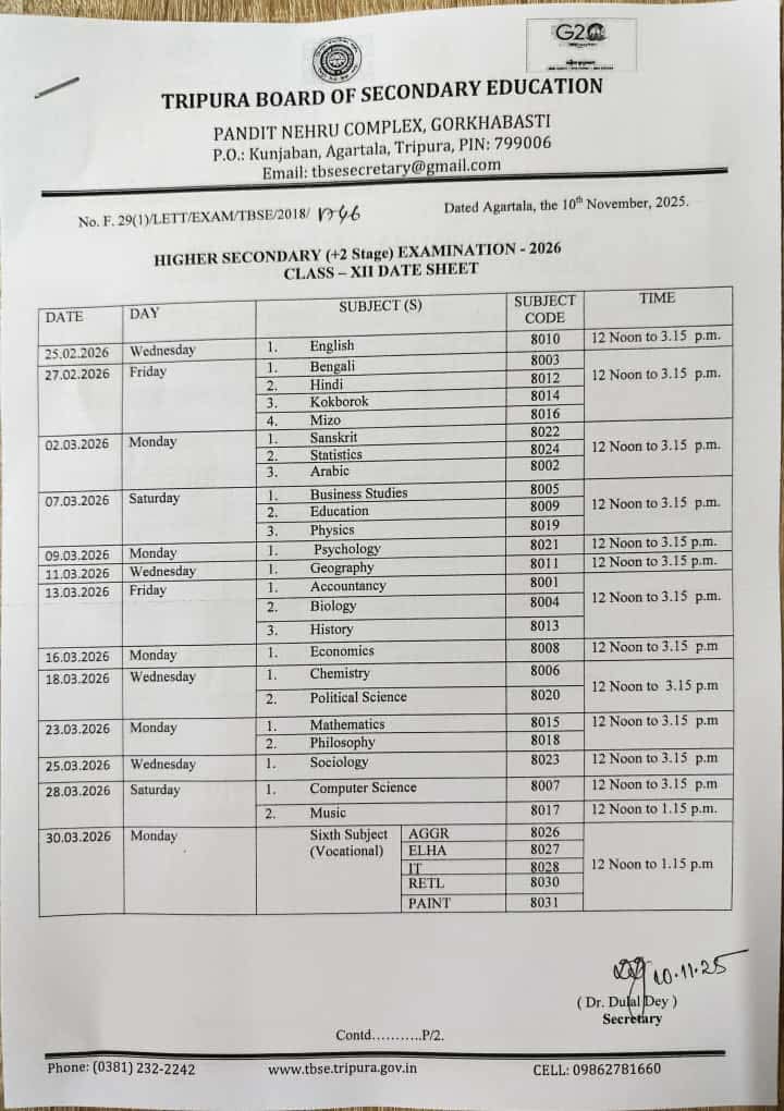 নিউজ সুবার্তা ডিজিটাল ডেস্ক, Published on: 10th Nov. 2025: আগামী বছরের ২৫শে ফেব্রুয়ারি থেকে টি বি এস সি পরিচালিত ২০২৬ সালের মাধ্যমিক ও উচ্চ মাধ্যমিক পরীক্ষা শুরু হবে ।এদিন থেকে শুরু হবে উচ্চ মাধ্যমিক পরীক্ষা। প্রথম দিন ইংরেজি বিষয়ের উপর পরীক্ষা হবে। দ্বিতীয় দিন হবে বাংলা বিষয়ের উপর। আগামী ৩০শে মার্চ পরীক্ষা সম্পন্ন হবে। পরীক্ষা হবে মোট ১৩ দিন। অপরদিকে মাধ্যমিক পরীক্ষা শুরু হবে ২৬শে ফেব্রুয়ারি থেকে। পরীক্ষা শেষ হবে আগামী ২৪শে মার্চ। সোমবার বিকেলে ত্রিপুরা মধ্যশিক্ষা পর্ষদ ভবনে এক সাংবাদিক সম্মেলন করে একথা জানালেন পর্ষদ সভাপতি ধনঞ্জয় গন চৌধুরী।