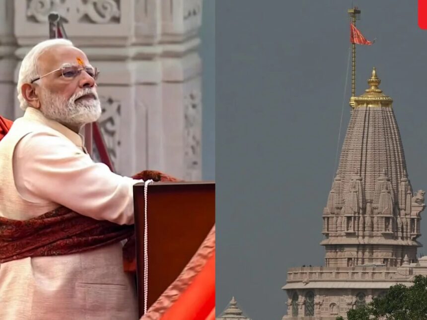 নিউজ সুবার্তা ডিজিটাল ডেস্ক, Published on:  25th Nov. 2025:                      অযোধ্যার আকাশে সগর্বে উড়ছে ‘ধর্মধ্বজ’। আগাম ঘোষণা অনুসারে মঙ্গলবার ধ্বজা উত্তোলন করে আবেগাপ্লুত প্রধানমন্ত্রী নরেন্দ্র মোদি। তিনি জানিয়ে দিলেন, ”শতাব্দী প্রাচীন ক্ষত আজ জুড়লো।” সেই সঙ্গেই তাঁর দাবি, আগামী কয়েকশো বছর ধরে উড়তে থাকবে এই নিশান।মঙ্গলবার সকালে আরএসএস প্রধান মোহন ভাগবতের সঙ্গে রামমন্দিরে উপস্থিত হন প্রধানমন্ত্রী নরেন্দ্র মোদি। একসঙ্গে রামলালার আরতি করেন দু’জনে। তারপর বেলা ১১টা ৫০ নাগাদ শুরু হয় ধ্বজারোহণ পর্ব। নিচ থেকে ধীরে ধীরে মন্দিরে সর্বোচ্চ চূড়া পর্যন্ত উঠে যায় ন্যায়ের ধ্বজা। গোটা প্রক্রিয়ার সময়ে আবেগঘন চোখে ধ্বজার দিকে তাকিয়ে ছিলেন নরেন্দ্র মোদি। ধ্বজারোহণ পর্ব শেষ হতেই করজোড়ে নমস্কার করেন। তারপর ফুল উৎসর্গ করেন মোদি-ভাগবত দু’জনেই।উল্লেখ্য, গত বছরের ২২শে জানুয়ারি রামলালার প্রাণপ্রতিষ্ঠা হয়েছিল অযোধ্যার রামমন্দিরে। তবে মন্দির নির্মাণের কাজ সম্পন্ন হয়নি। প্রায় দু’বছর পর মন্দির নির্মাণ শেষ হয়েছে। অর্থাৎ এই মন্দির এবার পুরোপুরিভাবে রামলালার ধর্মীয় আবাসে রূপান্তরিত হবে। এই বিষয়টিকে দ্বিতীয় প্রাণপ্রতিষ্ঠা বলেও অভিহিত করছেন পুরোহিতদের একাংশ।