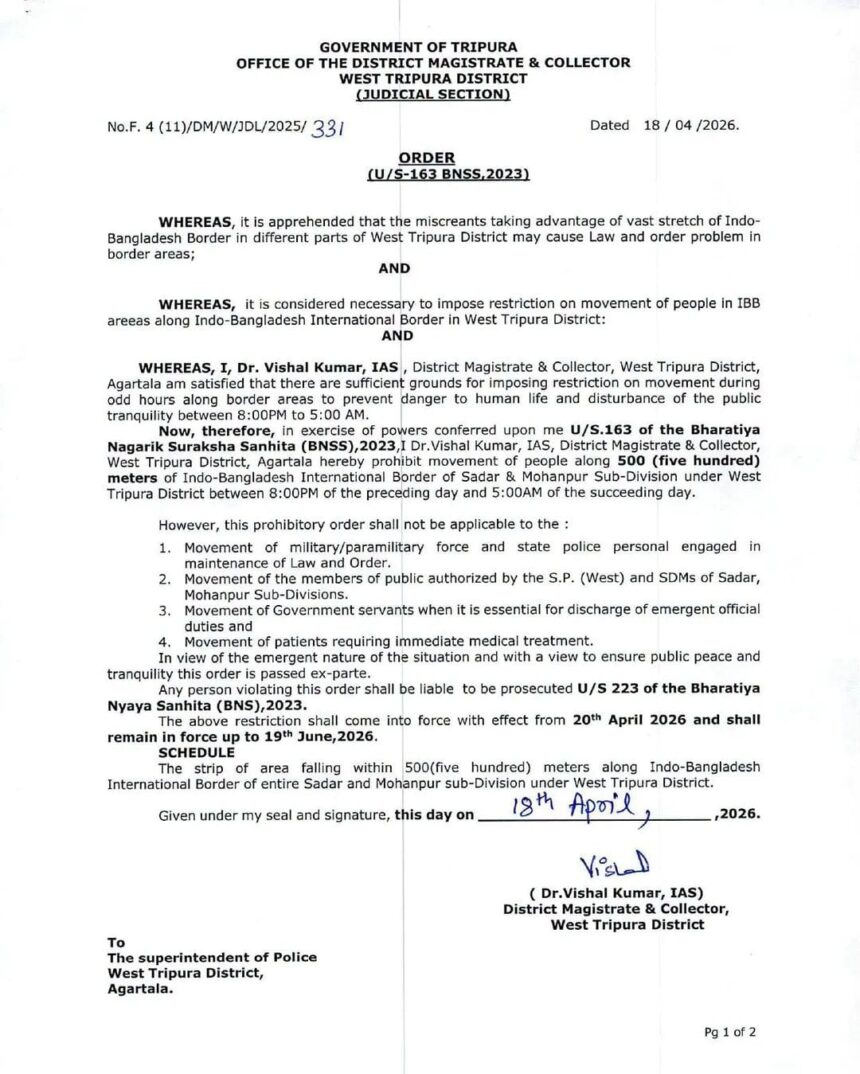 নিউজ সুবার্তা ডিজিটাল ডেস্ক, Published on: 20th April. 2026 :                  আইন শৃঙ্খলা বজায় রাখার লক্ষ্যে ২০ এপ্রিল থেকে আগামী ১৯শে জুন পর্যন্ত সদর ও মোহনপুর মহকুমার অন্তর্গত ভারত-বাংলাদেশ আন্তর্জাতিক সীমান্তের ৫০০ মিটারের মধ্যে রাতের বেলায় অর্থাৎ রাত ৮টা থেকে ভোর ৫টা পর্যন্ত জনসাধারণের চলাচল নিষিদ্ধ করা হয়েছে। এব্যাপারে সোমবার সংবাদ মাধ্যমের মুখোমুখি হয়ে পশ্চিম ত্রিপুরা জেলার জেলা শাসক ডাঃ বিশাল কুমার জানান, ভারত-বাংলাদেশ আন্তর্জাতিক সীমান্তের ৫০০ মিটার পর্যন্ত ১৬৩ ধারায় নির্দিষ্ট সময়ে জনসাধারণের চলাচল নিষিদ্ধ করা হয়েছে। এই সময়ে বি এস এফ’কে কিছু অধিকার দেওয়া হয়েছে। যাতে বি এস এফ অবৈধ কার্যকলাপ রুখতে পারে। তবে এই সকল জায়গায় আম জনতা স্বাভাবিক ভাবেই জীবন জাপন করতে পারবে বলে জেলা শাসক জানান।